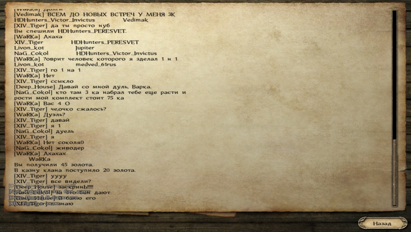 4. Мат в мой адрес. Считал, что убегать от противника запрещено на битве, если остался один. На осаде о таком не слышал. Даже если не прав, меня исключили голосованием, надеюсь, этого было достаточно для меня. Но никто не имеет право меня оскорблять, прошу разобраться.